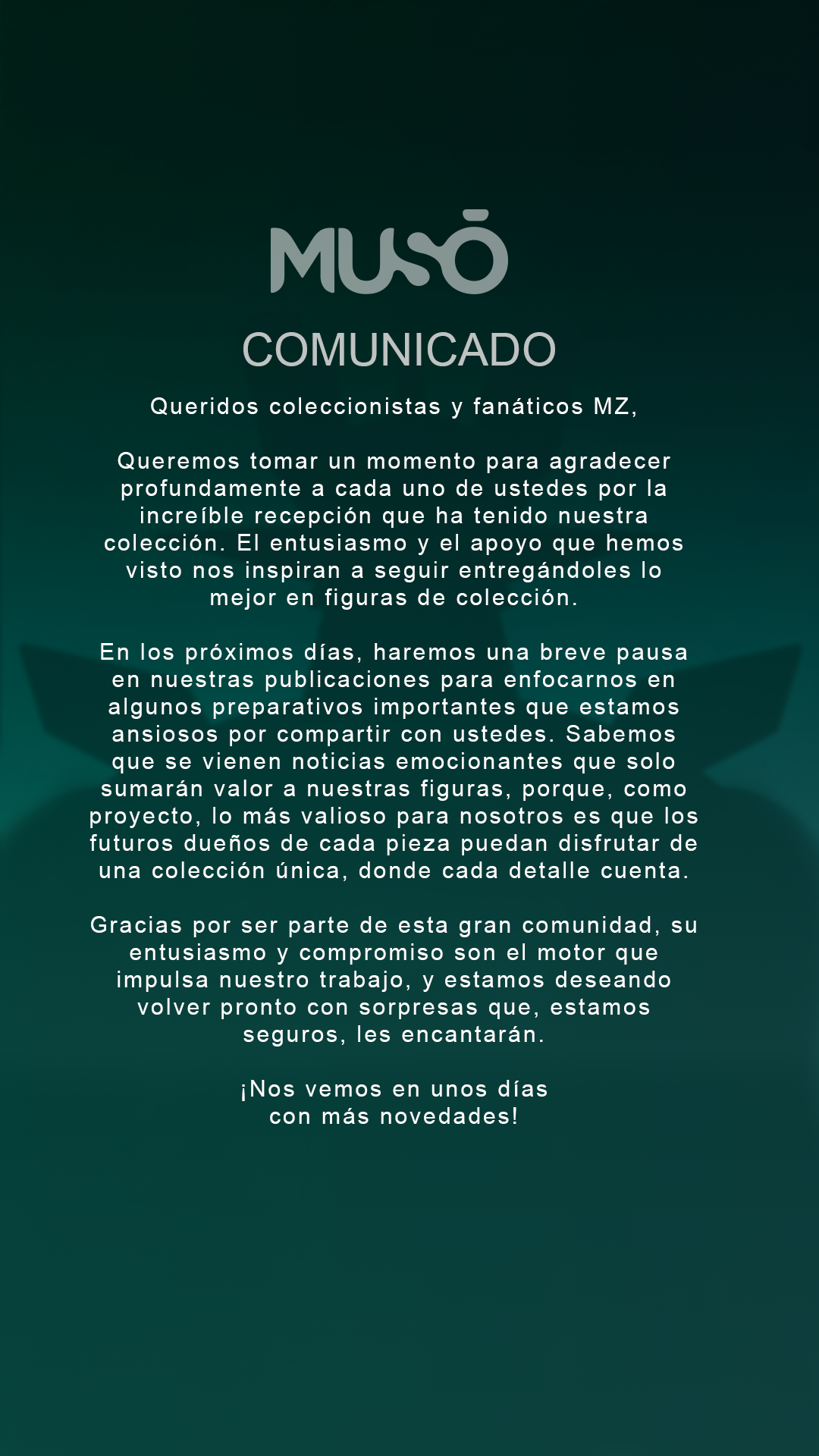 En los próximos días, haremos una breve pausa en nuestras publicaciones para enfocarnos en algunos preparativos importantes que estamos ansiosos por compartir con ustedes. Sabemos que se vienen noticias emocionantes que solo sumarán valor a nuestras figuras, porque, como proyecto, lo más valioso para nosotros es que los futuros dueños de cada pieza puedan disfrutar de una colección única, donde cada detalle cuenta.